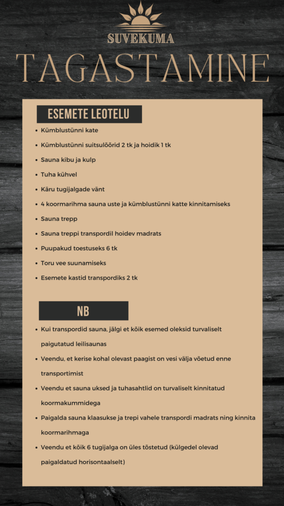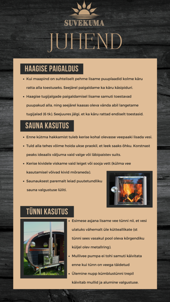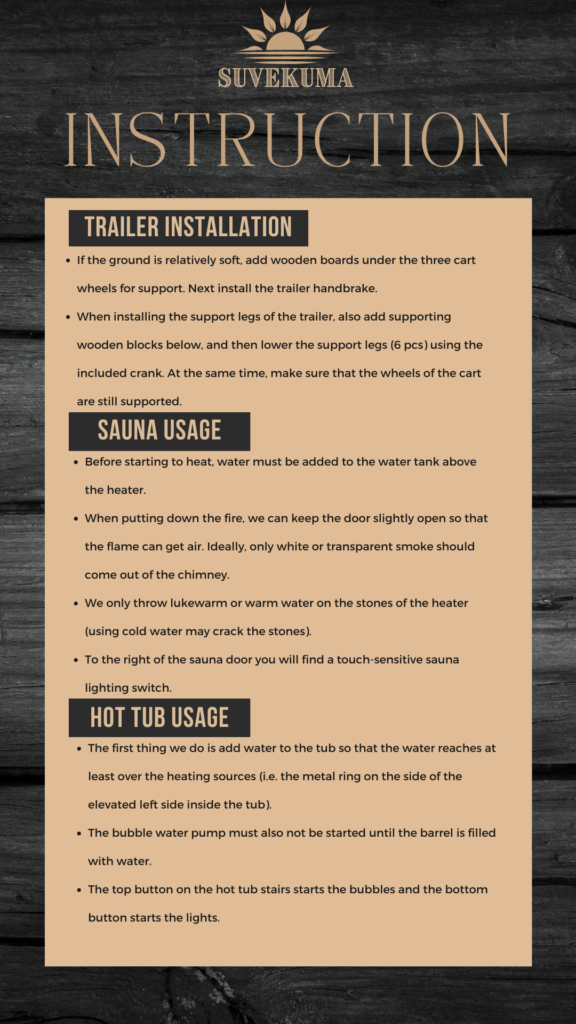Enne tellimist veendu, et mõõtudelt mahub saun soovitud asukohta sõitma – laius 2,3 m, kõrgus ilma korstnata 2,14 m. Korsten asub haagisest tagant poolt vaadeldes paremal pool ja on ligi 1 m kõrge (st jälgi sissesõidutee läheduses olevaid puid). Sisenemine haagise paremal küljel.