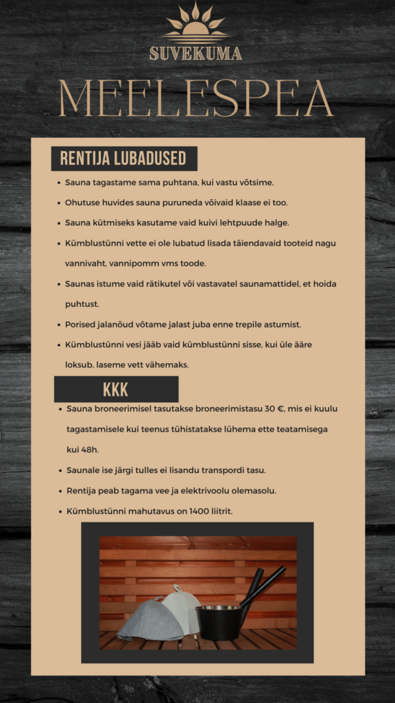 Meie sauna ja tünnisauna mahub ligi 5 inimest mugavalt lõõgastuma. Saunas annab sooja Harvia keris, mis tulenevalt sauna suurusest teeb leili mõnusalt pehmeks ja niiskeks. Suvel saab sauna soojaks kütta u 20-30 minutiga.